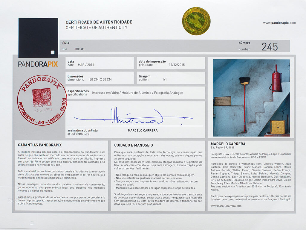 Através do Certificado PandoraPix, destacamos o tamanho e a tiragem da obra, estabelecendo um compromisso com nossos clientes e com o mercado da arte. Assim, ao assinar o certificado, o autor se compromete a não produzir cópias adicionais além da quantidade informada. Essa medida valoriza a exclusividade da obra bm como dá aos colecionadores a garantia de possuírem um item único e especial em sua coleção.
